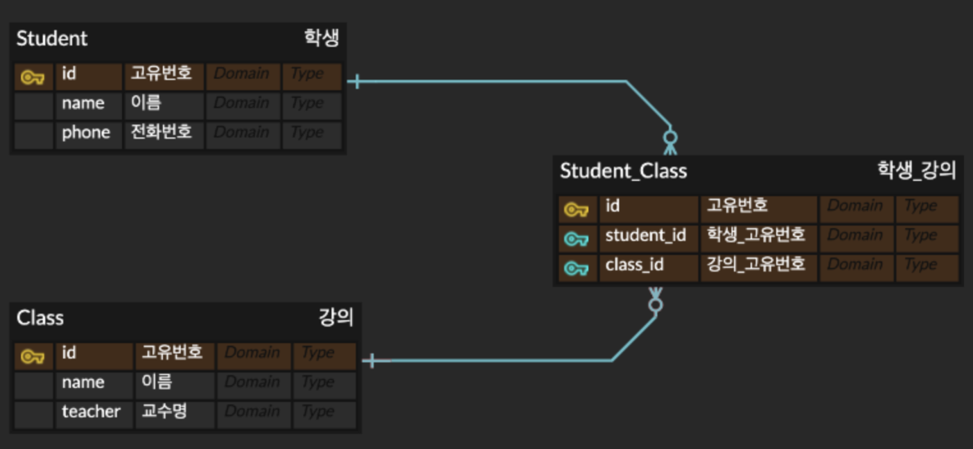 학생과 강의의 관계를 정의하면 어떻게 될까? 학생도 강의를 많이 들을 수 있고 강의도 여러 명의 학생을 포함할 수 있다. 이 경우 N:M 이 된다.
