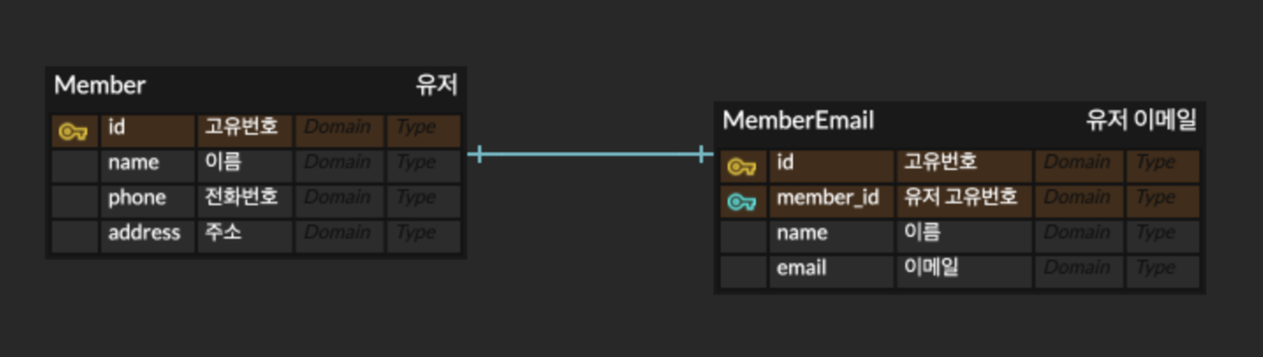 예를 들어 유저당 유저 이메일은 한 개씩 있다고 가정하면 이 경우 1:1 관계가 된다.