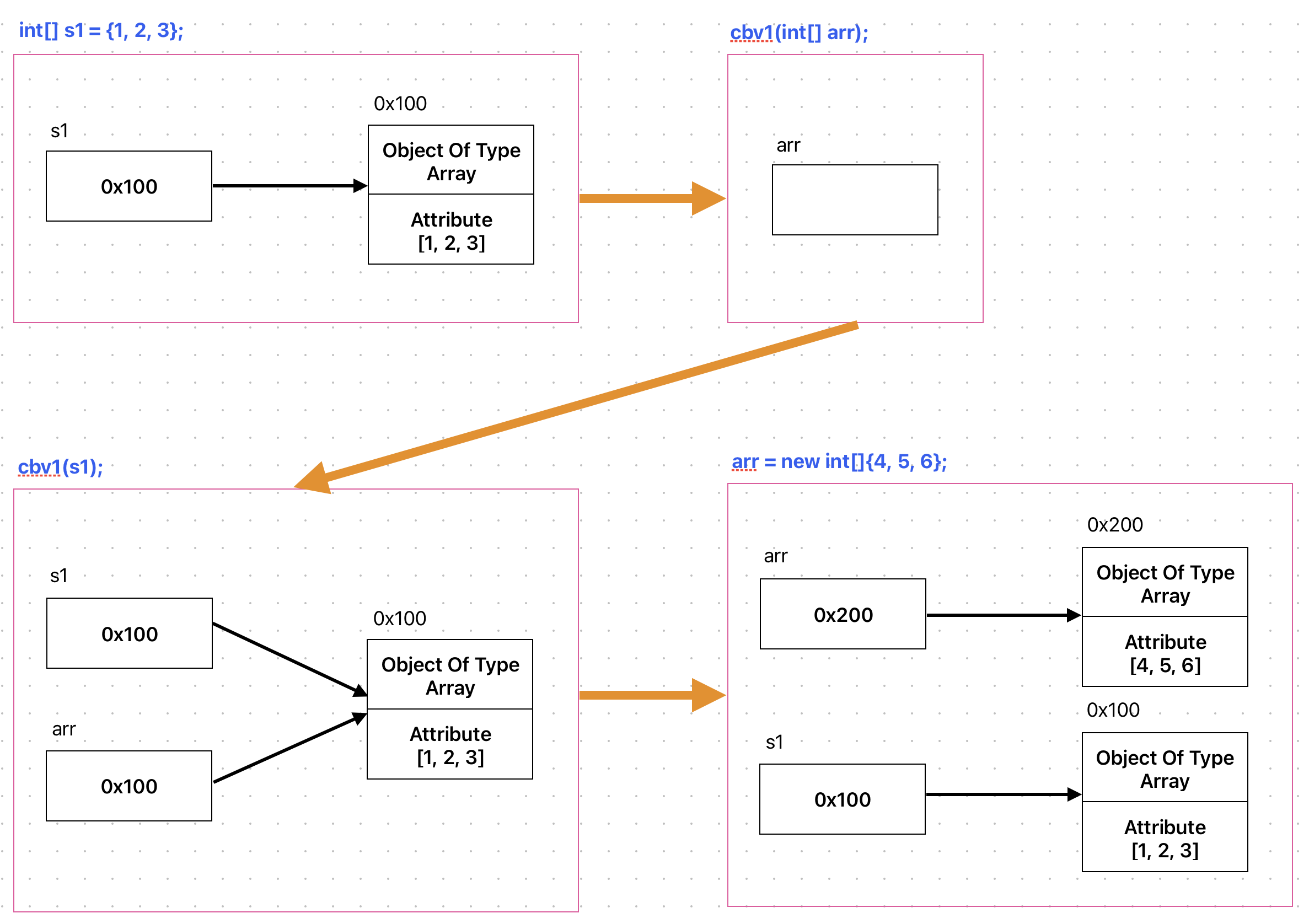 3. 메서드 내부에 할당 받은 객체에 새로운 메모리 값으로 할당은 불가능 (1번 예시에서 새로운 메모리 값줘도 원래 있던 0x100 은 사라지지 않았음)