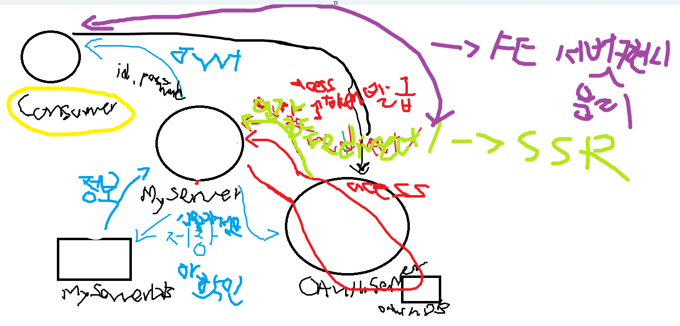 Consumer은 사용자인데 사용자가 내가 만든 서버에 정보를 넘겨주고 내 서버에서 카카오나 구글 같은 서버로 API를 사용해서 리다이렉트하고 카카오, 구글의 사용자 정보를 확인 후에 일치하면 반환 받고 내 서버로 다시 돌려 준 후 DB에 없으면 저장한다음 회원가입이면 뭐 완료됐다고 하고, 로그인이면 토큰을 줬다고 한다.