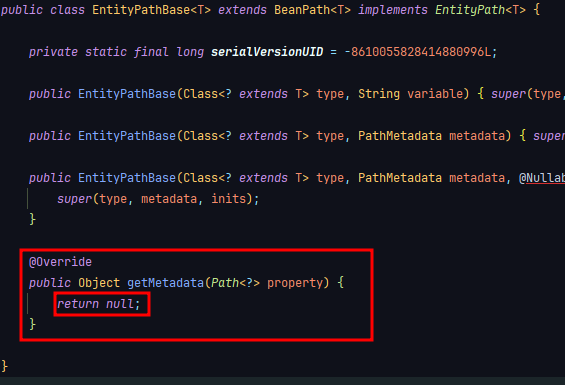 실제 EntityPathBase는 getMetadata가 구현되어 돌아간다고 한다.