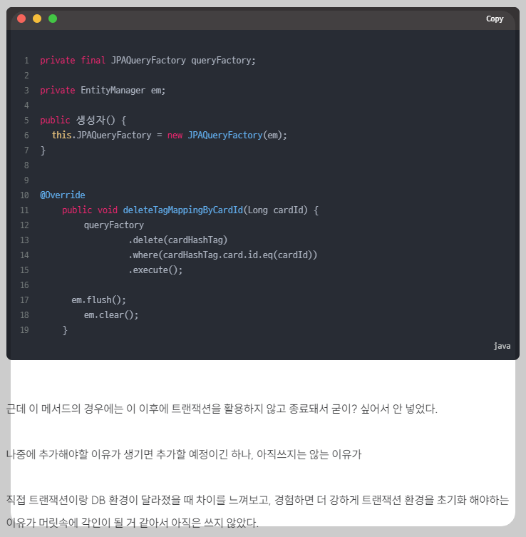 근데 Repository에서 flush및 clear를 하려면 만들어 놨던 JPAQueryFactory 빈을 사용하지 않고,